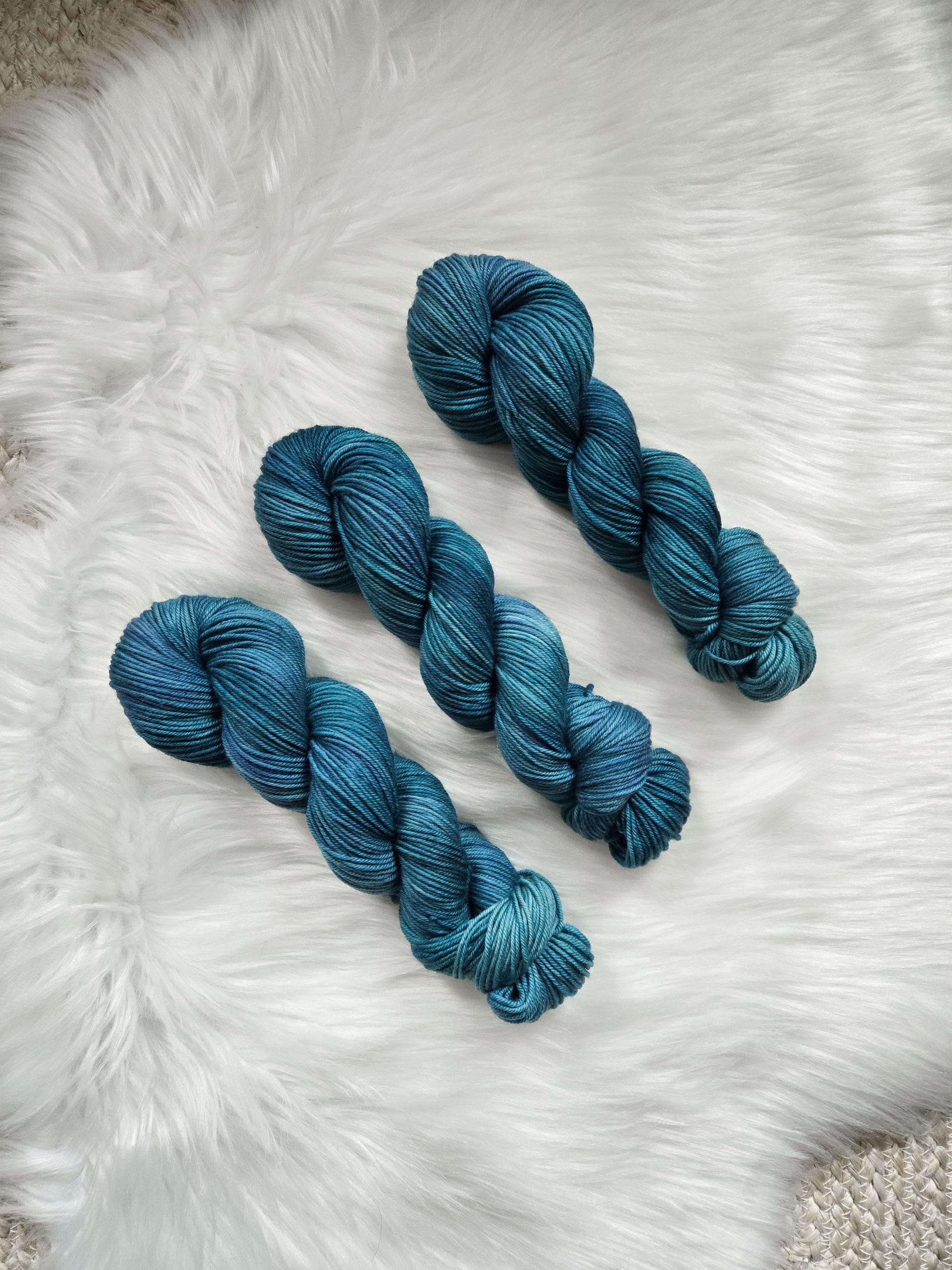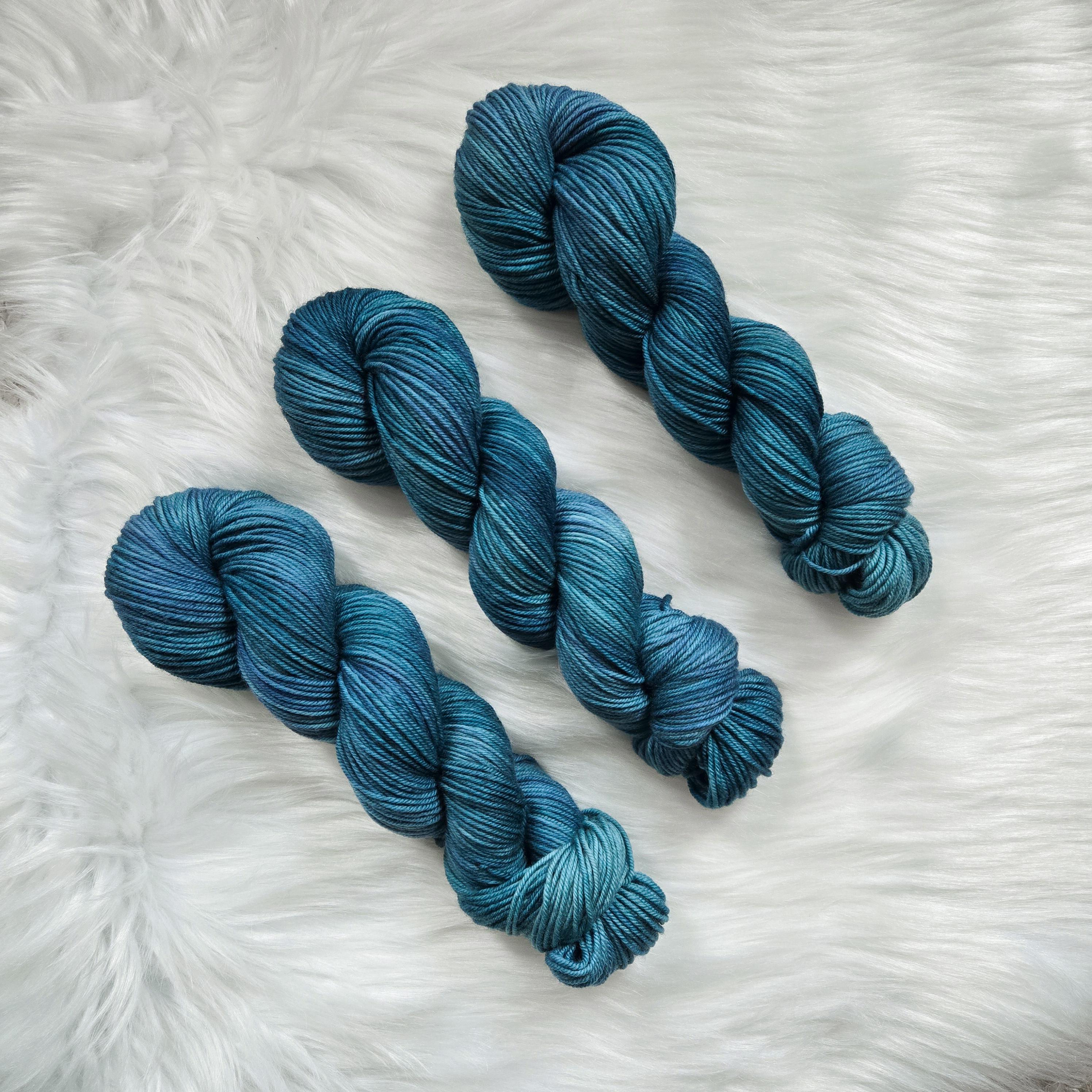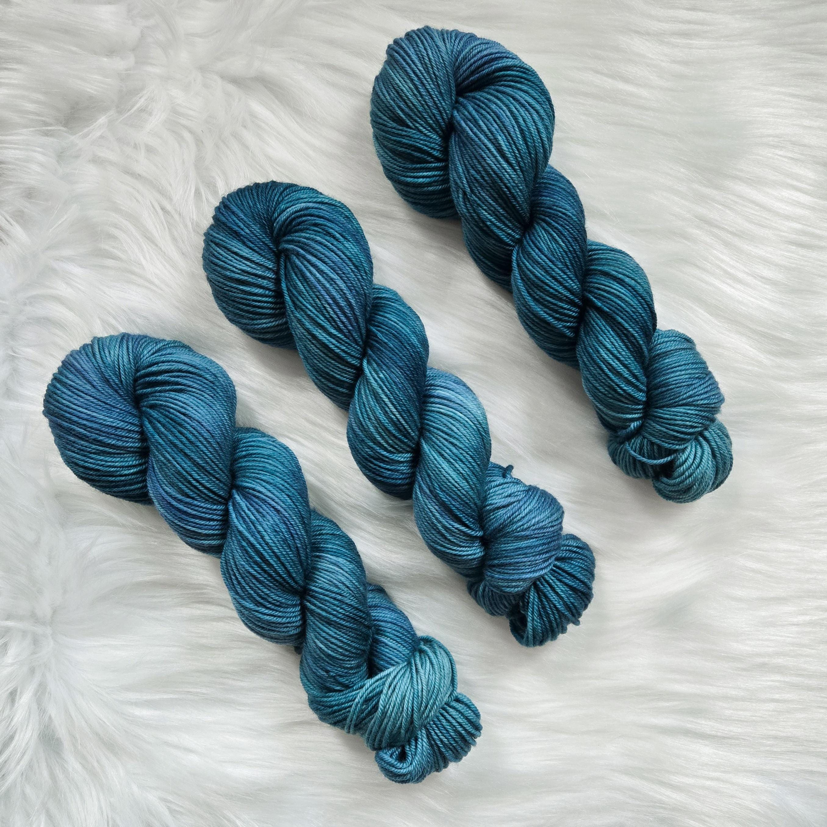Sea Serpent is the darker sister of Sea Witch with dark oceany teals and hints of blue and periwinkle on our Cozy DK base.