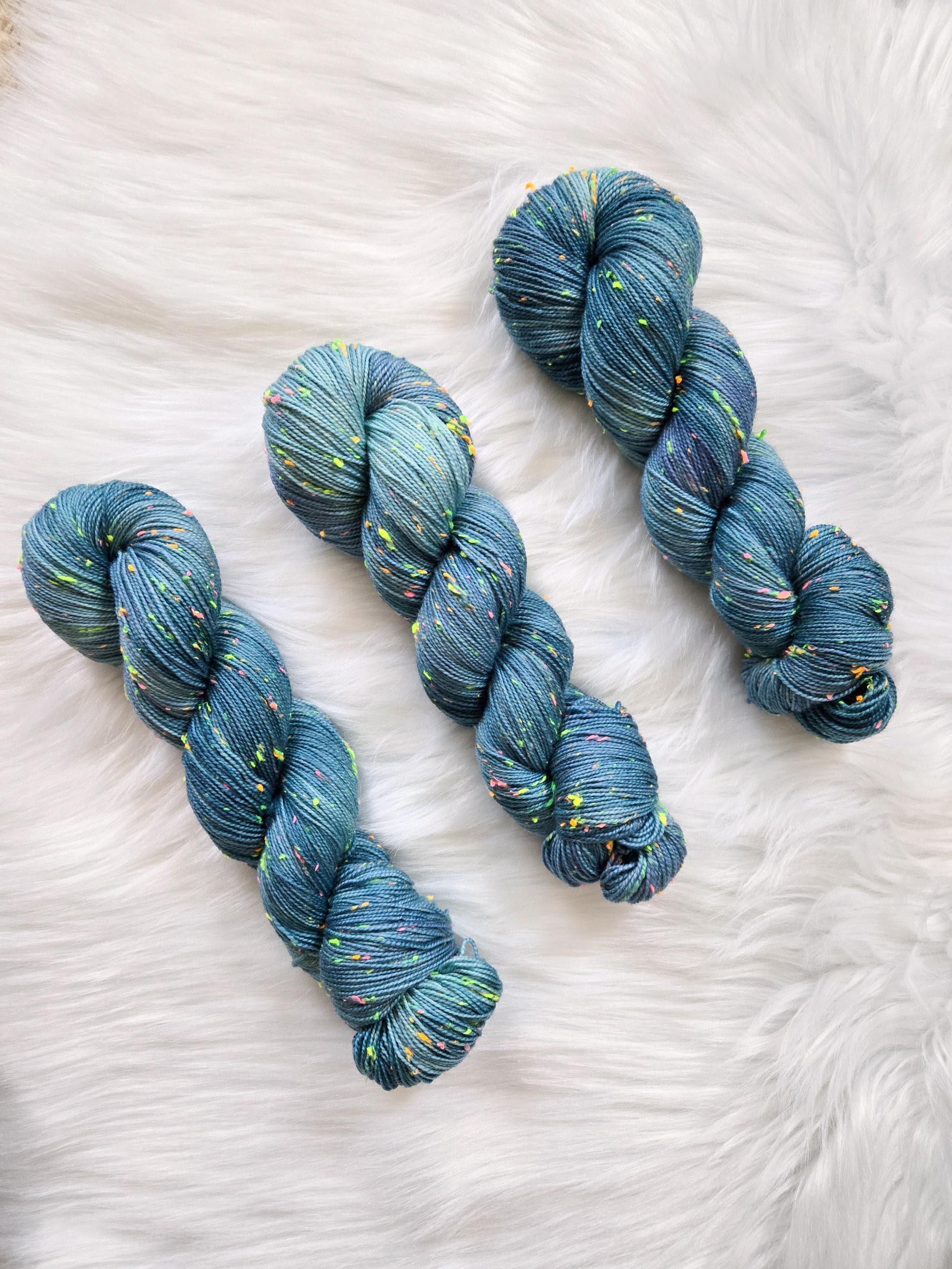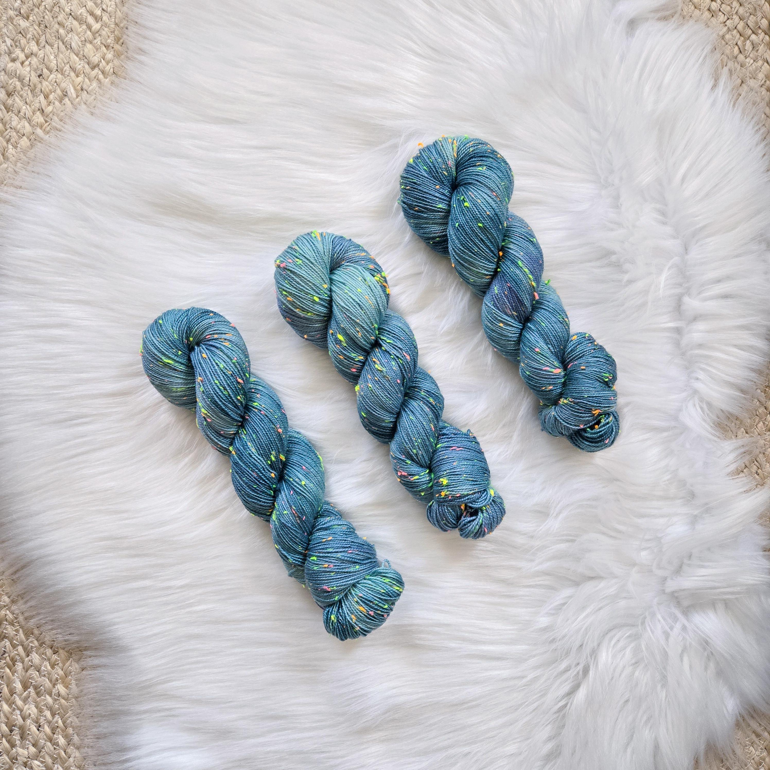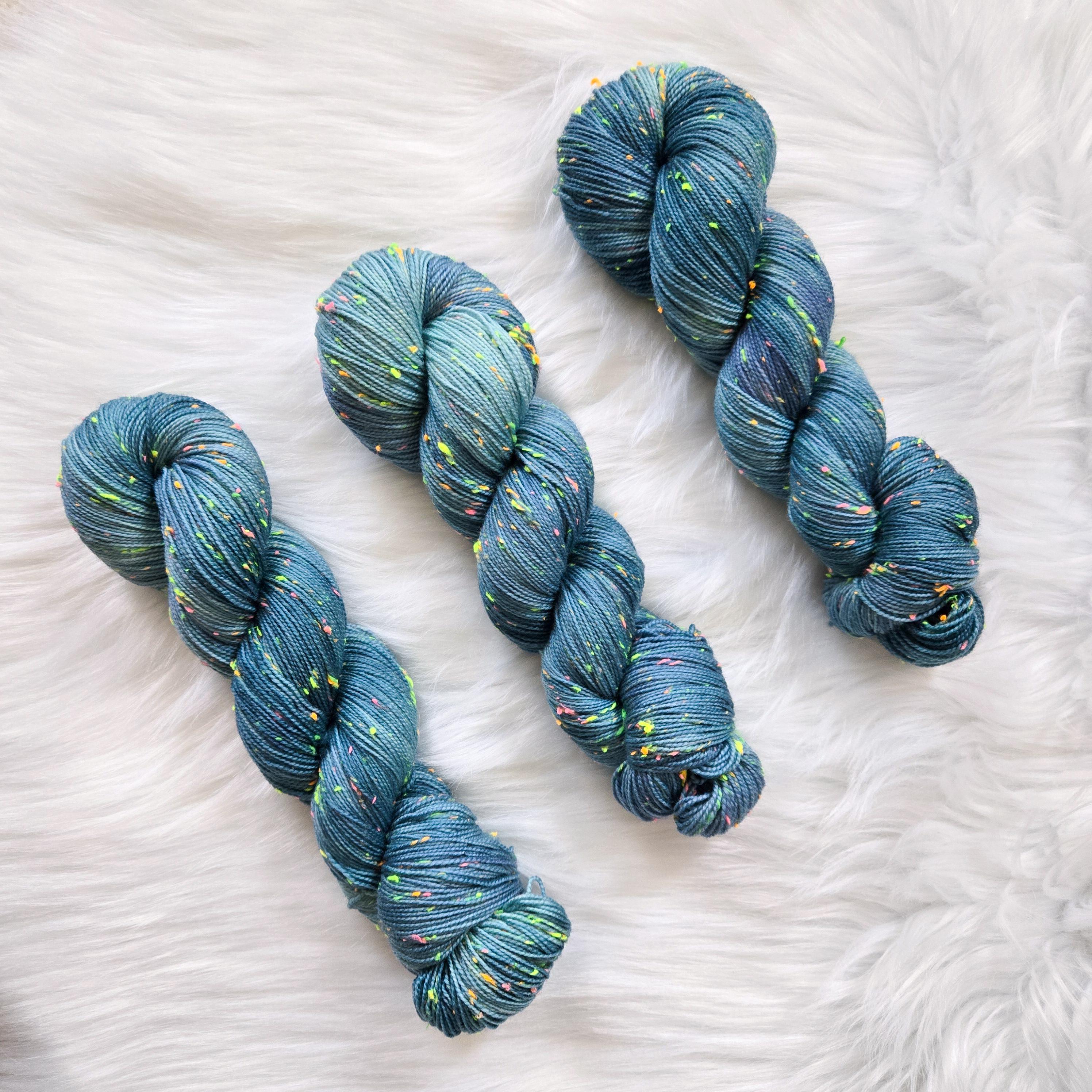 Sea Witch is an oceany teal with hints of blue and periwinkle on our Neon base that is filled with neon pink, yellow, orange, and green neps, similar to a tweed yarn.