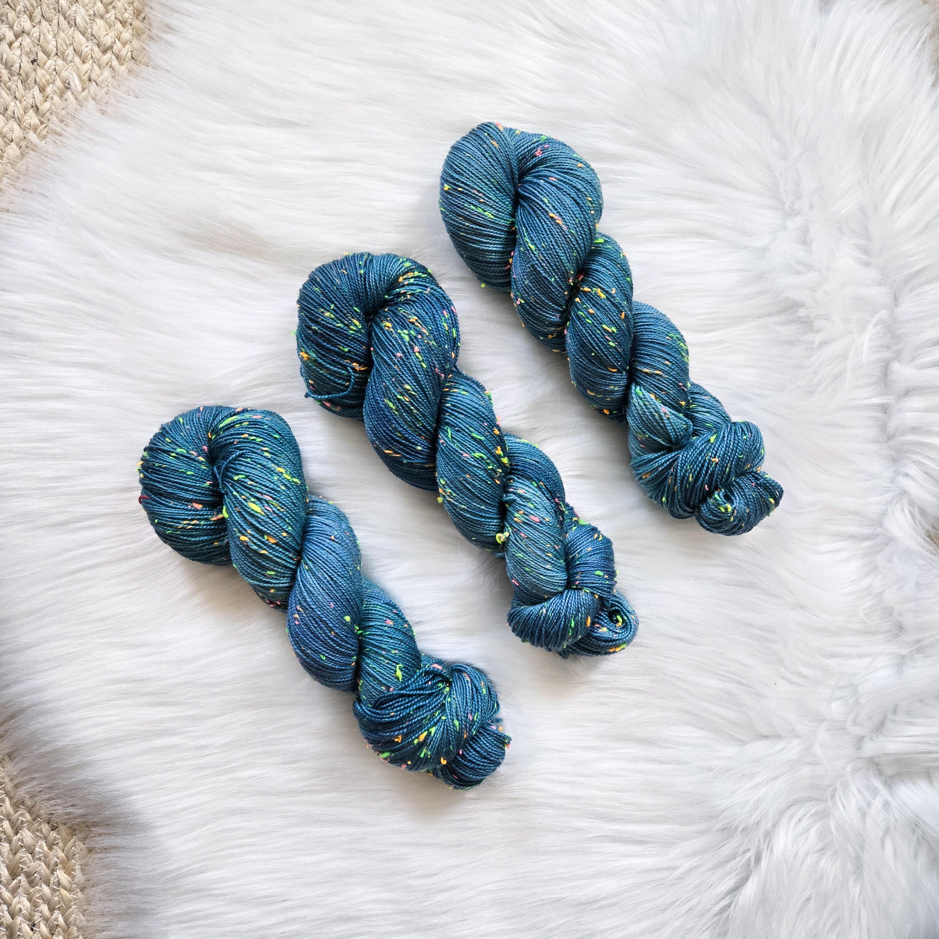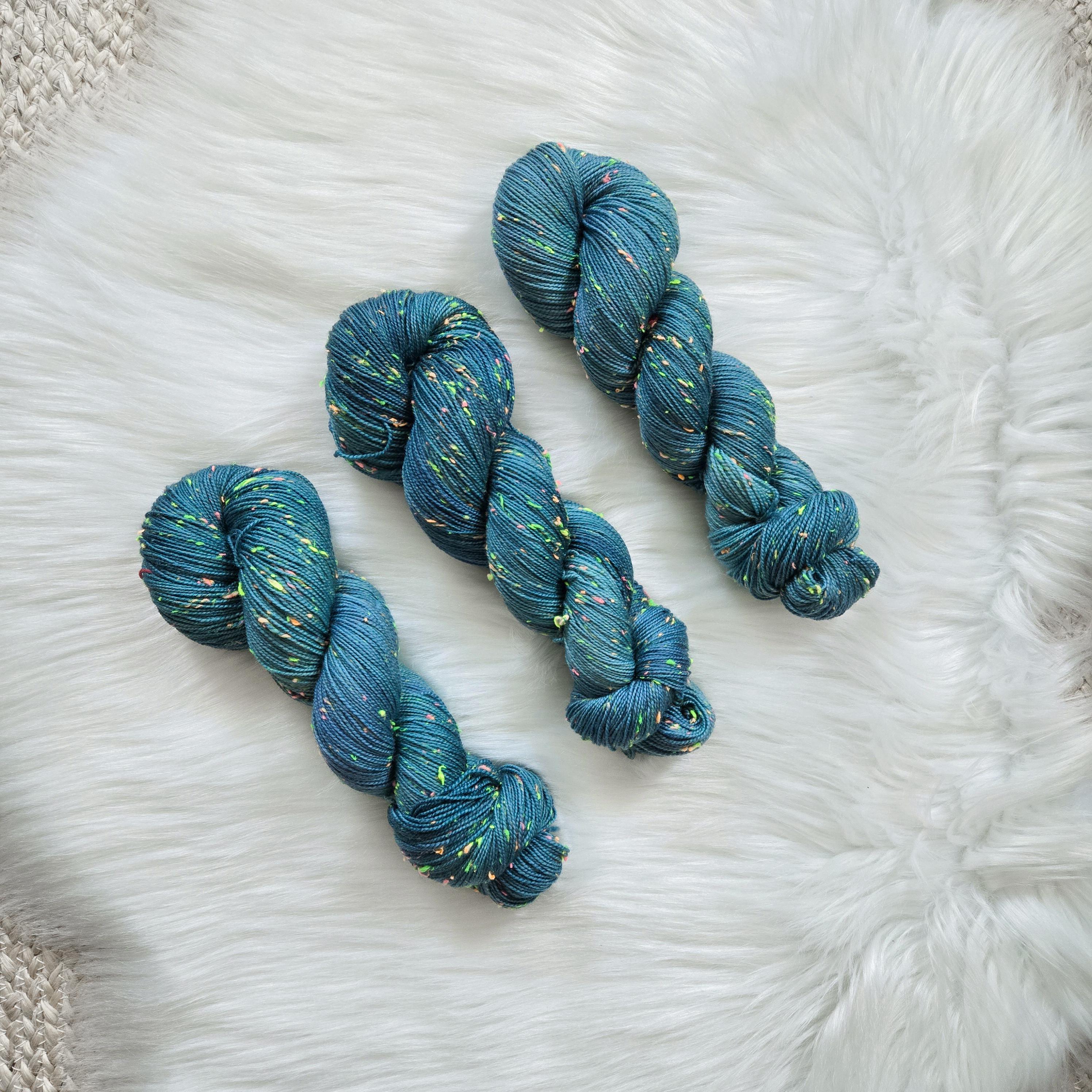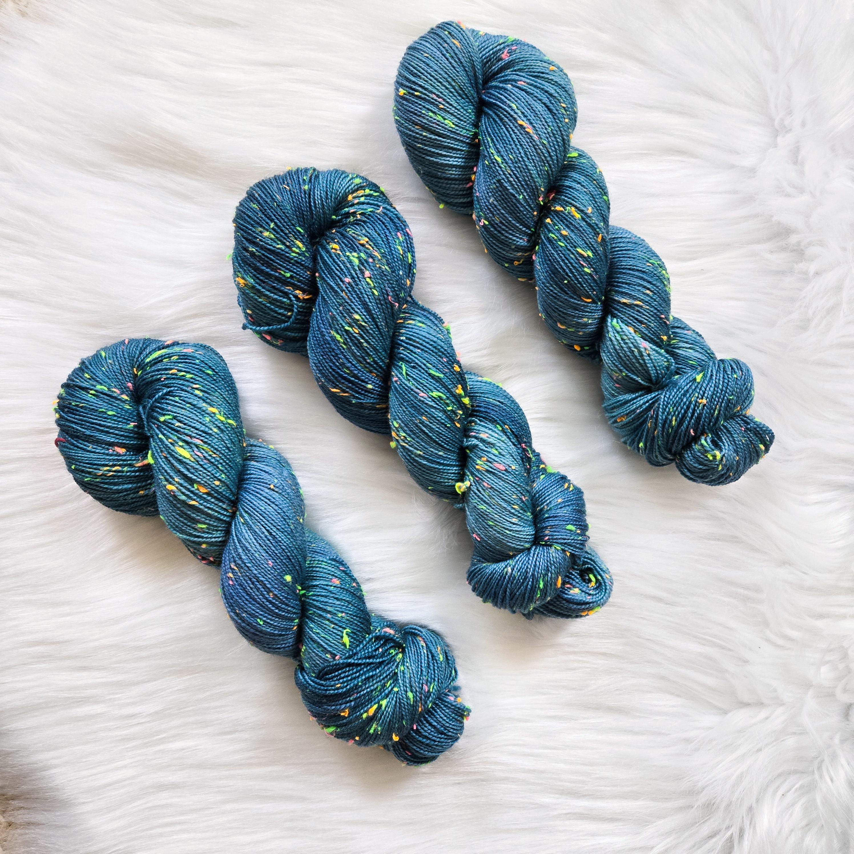 Sea Serpent is the darker sister of Sea Witch, an oceany dark teal with hints of blue and periwinkle on our Neon base that is filled with neon pink, yellow, orange, and green neps, similar to a tweed yarn.