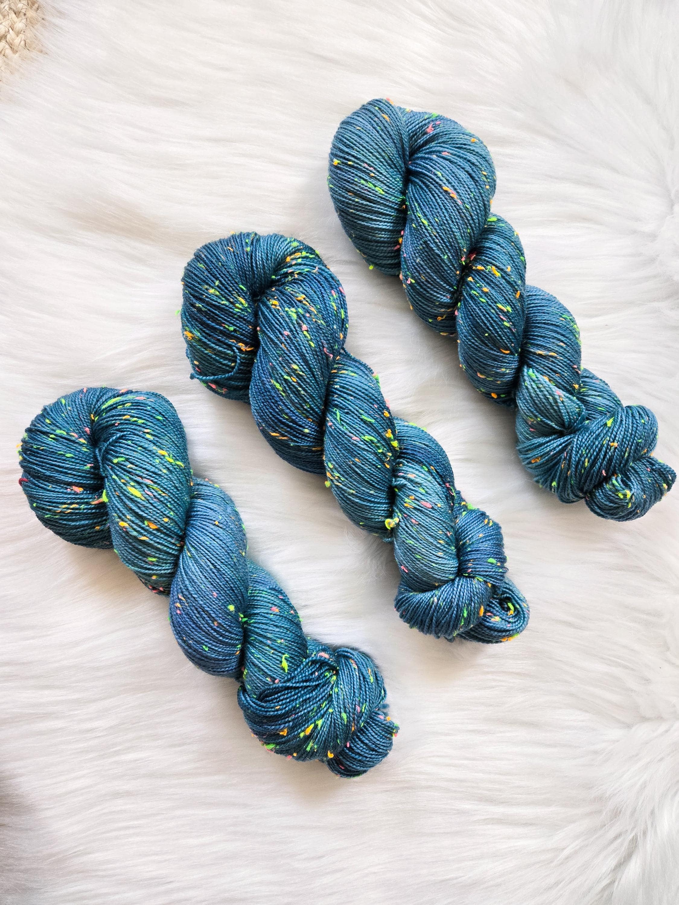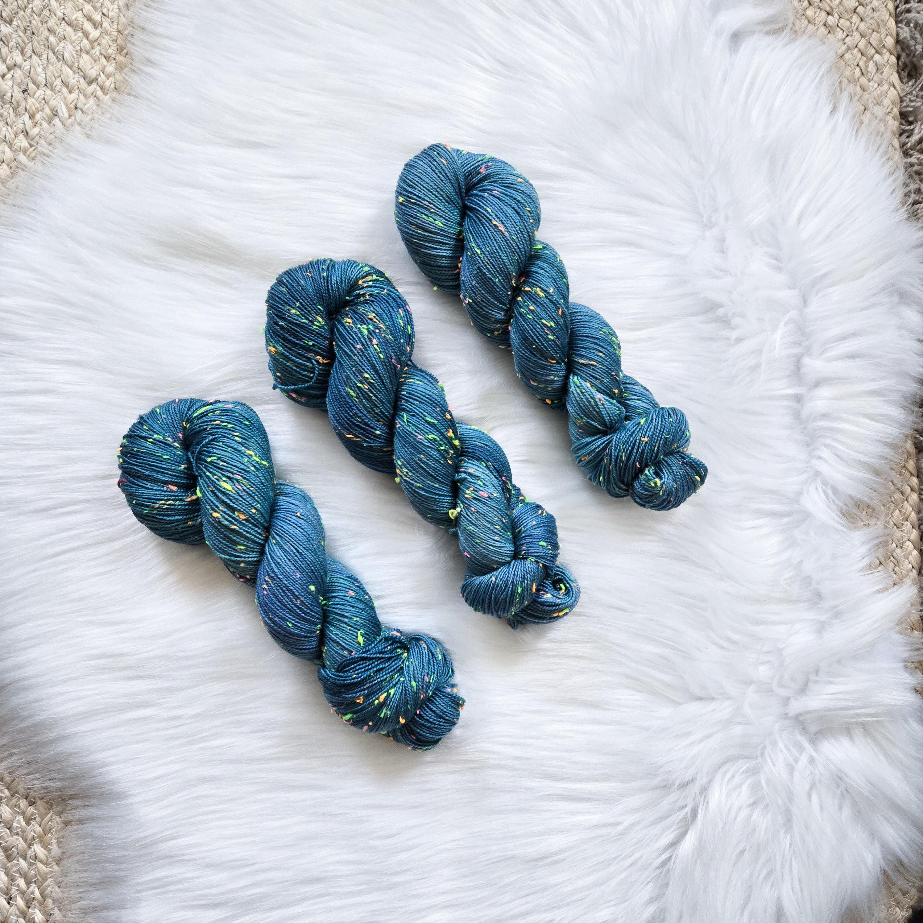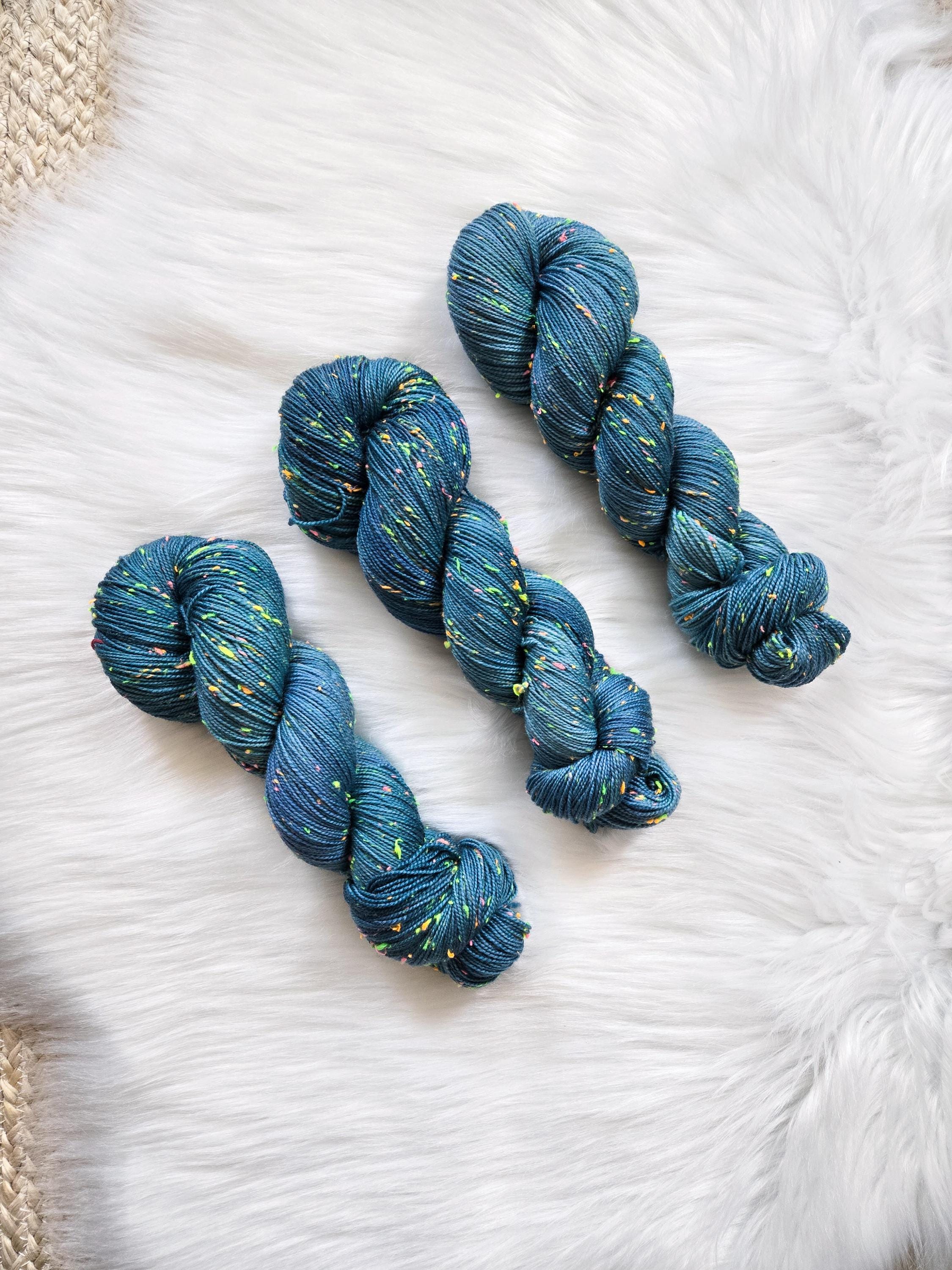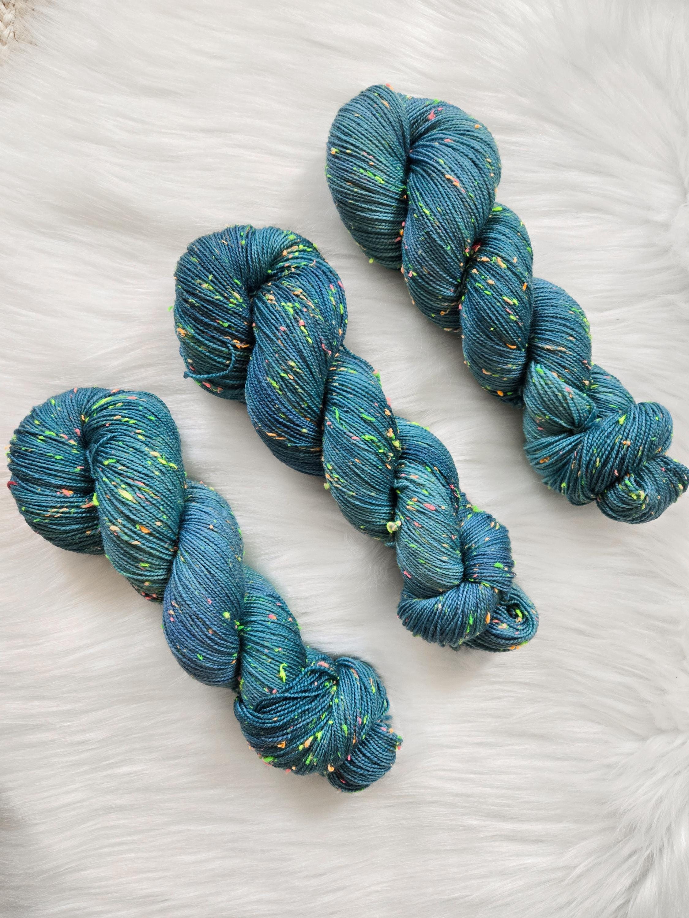Sea Serpent is the darker sister of Sea Witch, an oceany dark teal with hints of blue and periwinkle on our Neon base that is filled with neon pink, yellow, orange, and green neps, similar to a tweed yarn.
